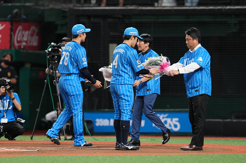 また、先行で行っていたwebキャンペーンで当選された方に足を運んでいただき、当選グッズをお渡しいたしました。球場内ビジョンでは東栄住宅のイメージキャラクターの成田凌さんが出演されているCMが流れました!始球式には、企業動画『悪の組織のアジト探し』で